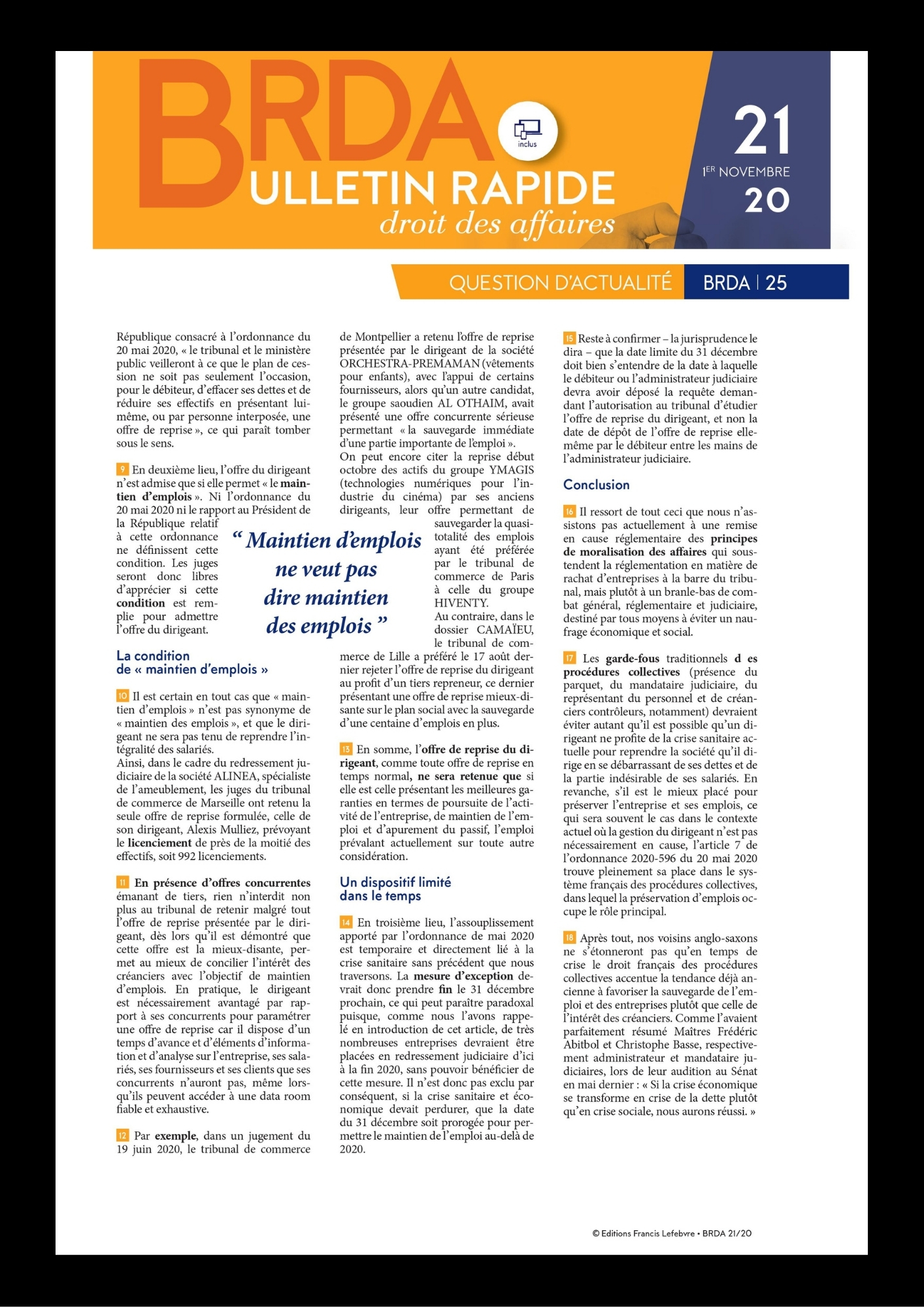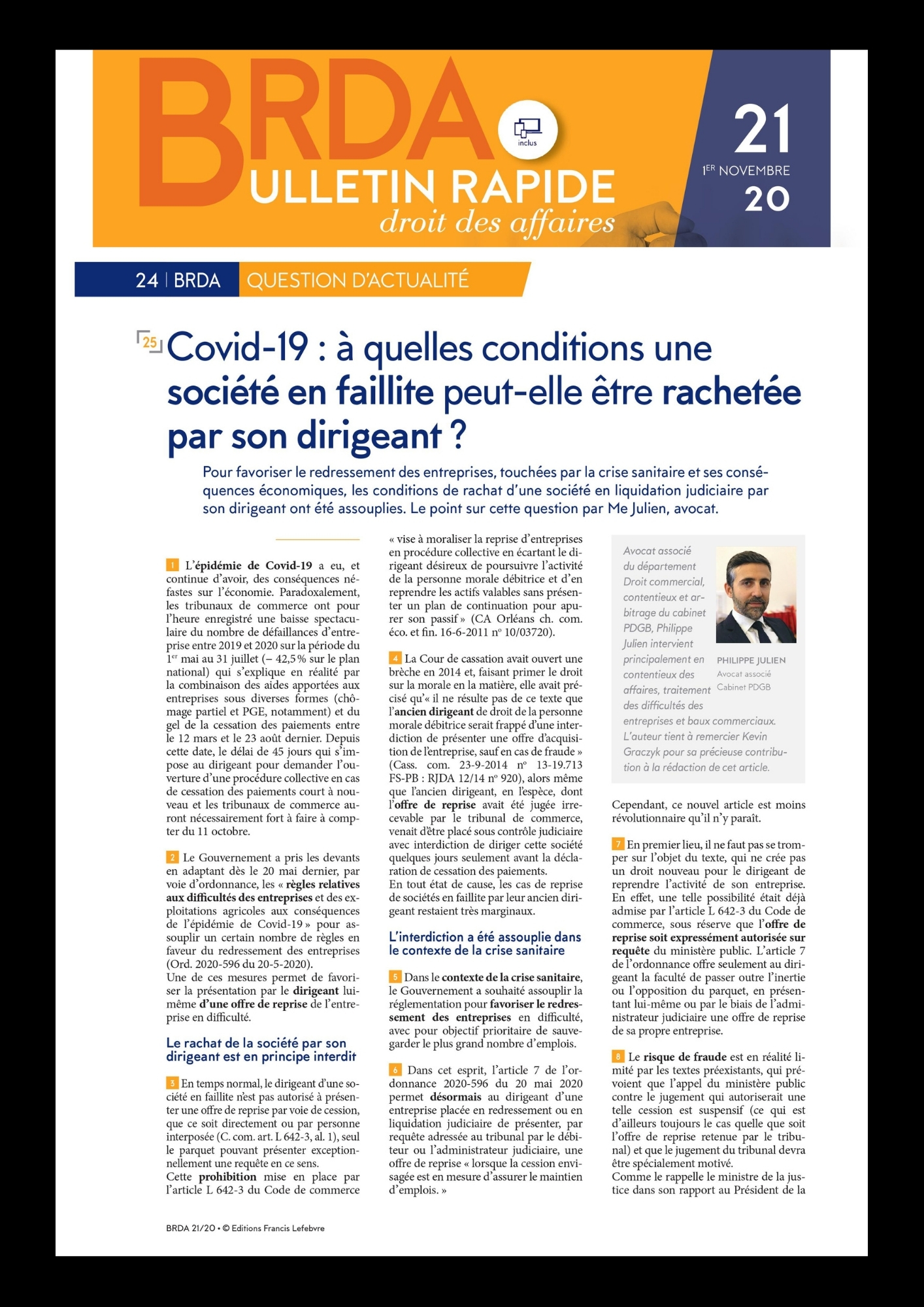 Dans un article pour le Bulletin Rapide Droit des Affaires, Philippe Julien, associé praticien des procédures collectives, fait le point sur l’assouplissement de la réglementation sur les conditions de rachat d’une société en liquidation judiciaire par son dirigeant.