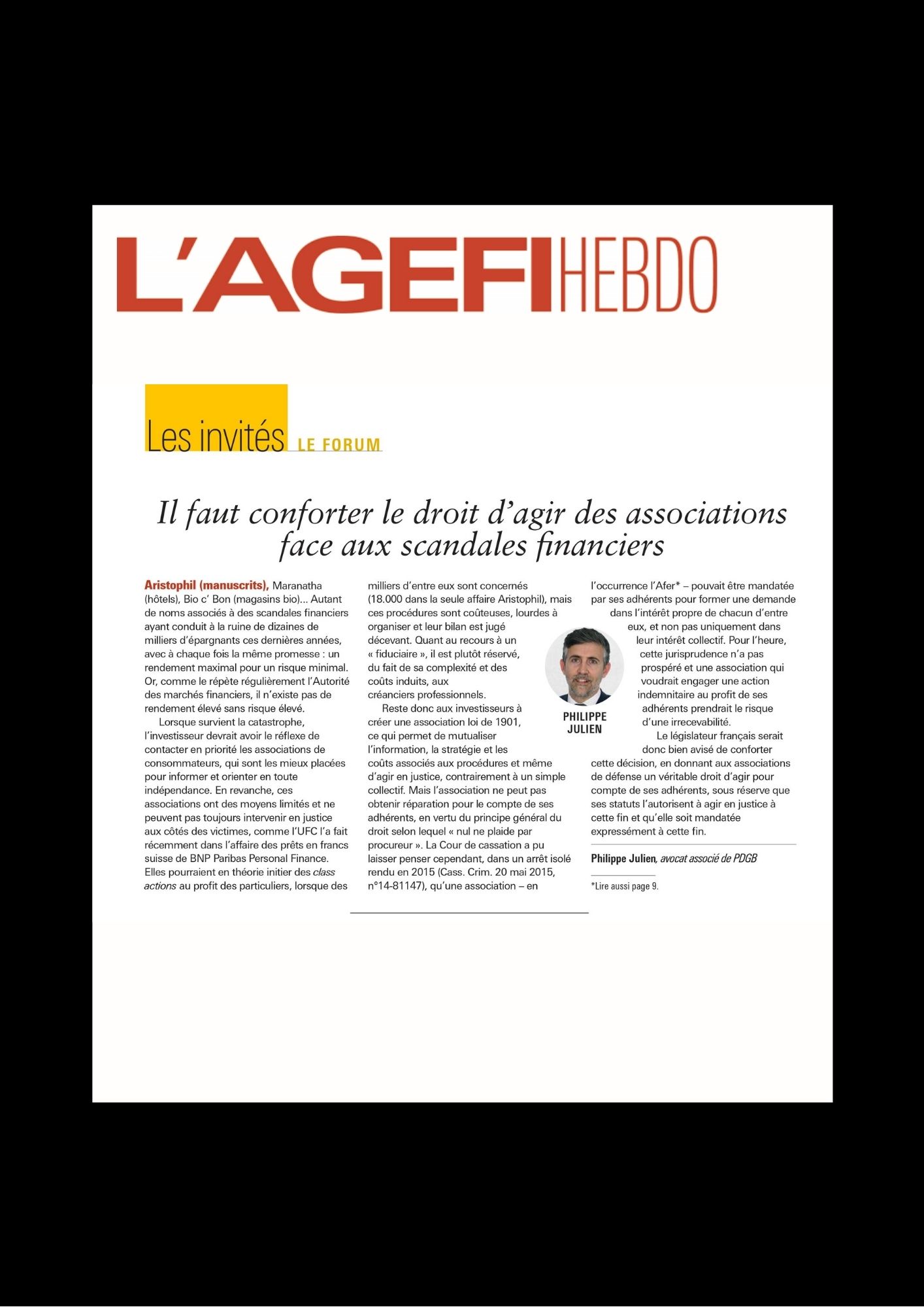 L’AGEFI Hebdo – Il faut conforter le droit d’agir des associations face aux scandales financiers